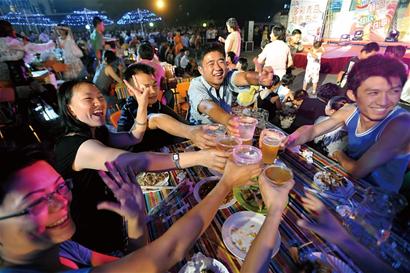 ????2005年,青島啤酒街正式開街。楊曉是啤酒街上的第一批業戶,在他的印象中,每年的8月至11月間,街道兩旁的酒店、啤酒吧都會無一例外地進入一年當中最火爆的經營時刻。啤酒造就了青島奇特的街景文化,鬧市老街,篷傘之下,一盤蛤蜊、幾串烤肉,端起晶瑩剔透的大玻璃杯,仰頭喝下冰涼的啤酒,是這座城市最大眾的夏夜消閑。今年6月15日,青島啤酒街提前兩個月開街,每天上萬名食客光顧,借著世界杯這個助推器,游客和市民沖破400萬,啤酒消費量超過2000噸,比開街那年超出了10倍還多。