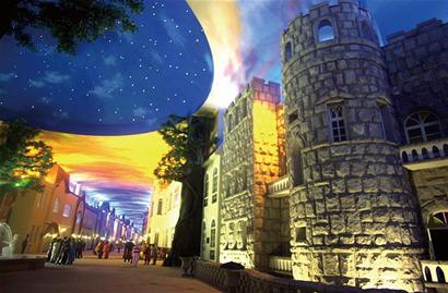 ????青島天幕城不僅吸引了近百家旅行社作為推薦線路,連日本最大的旅游批發商也斥資20萬元人民幣在日本推介銷售青島天幕城這一特色旅游產品。酒足飯飽看演出,城內除匯集全國山南海北的特色酒店外,還引入了兩家演藝工場,加上城內的各種特色演出,以及電玩娛樂城,再配上周圍的啤酒街、文化街、婚紗街、科技街等多條特色街道完全貫通,青島天幕城成為一個集吃、住、旅游、購物、休閑娛樂為一體的綜合性商務區。在特殊材料制成的棚頂上噴繪了絢麗多彩的圖畫,通過燈光的變化,以“天幕下的漫步”為特征,依次營造出 “旭日東升”、“正午當空”、“夕陽紅霞”、“午夜星辰”4種景觀,給人以震撼、新奇的視覺享受。城內濃縮了20多處青島最具代表性的著名歷史建筑景觀,形成了一道萬國建筑風景線。