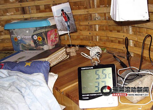 ????這里,離辦公室很近,平地距離4米、臺(tái)階29級(jí),不用擠公交,不用付房租,電費(fèi)水費(fèi)都省了——房間使用太陽(yáng)能照明,如果要用水,拿個(gè)桶去辦公樓提。只是,房間保溫性能不是太好,3日下午3點(diǎn),北京太陽(yáng)高照,“蛋屋”溫度計(jì)顯示,這里只有5.5℃。