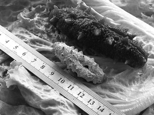 ????正規(guī)加工的淡干海參,色澤是灰黑色或灰色,比較堅硬,用兩手很難掰開,且分量較輕,敲著像木炭的感覺。而劣質(zhì)的干海參特別是加糖過多的海參,相對較脆,很容易被掰開,質(zhì)量再差一些的海參,參體特別是刺和吸盤,甚至已經(jīng)出現(xiàn)了破損。