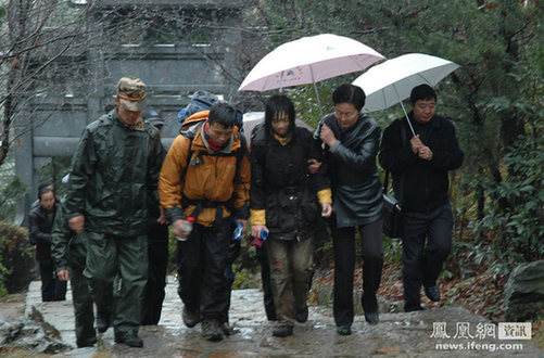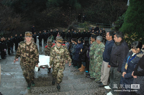 ????2010年12月13日凌晨2點37分,在安徽黃山景區因迷路被困的18名上海驢友在黃山景區一個未開發開放區域被當地搜救人員找到,不幸的是,50分鐘后,23歲的黃山風景區公安局民警張寧海在護送途中不幸墜崖身亡。圖為武警官兵護送張寧海的遺體。