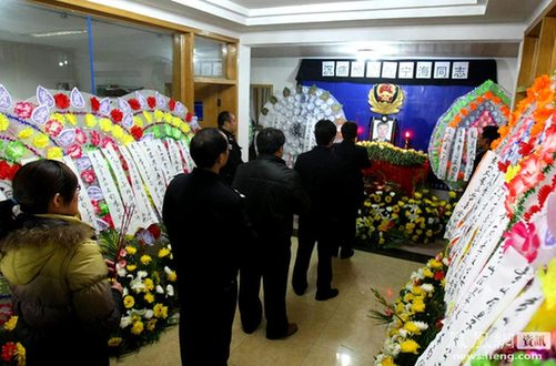 ????張寧海所在派出所一樓大堂已經被布置成靈堂,中央擺放著張寧海的巨幅遺像,20多個花圈、花籃,團團簇擁著帥氣、年輕的面龐。上千枝黃菊花放在靈堂入口,每一個進去的人都手拿一束黃花,向犧牲的戰友鞠躬。