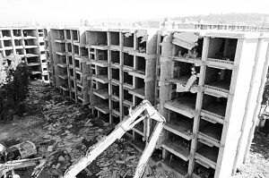 ????跑馬山實業總公司黨委書記王洪介紹,今年5月,廠里接到了拆遷通知,那些還沒有完工的經濟適用房,不得不停止建設。由于房屋還沒有完全建成,公司暫時沒有分房到戶,但由于房屋的所有權實際上歸員工所有,作為領導的王洪,既得不到拆遷辦的理解,也得不到職工的支持,“拆遷辦的說我不支持他們的工作,職工們說我不為他們說話,我兩頭為難。”他說,這13棟房子就好像廠里的孩子,現在可能要夭折,他十分心痛。