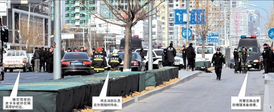 昨天上午11點,在朝陽區西大望路上,4輛警車前后夾擊攔下一輛白色豐田皮卡車后,司機侯某稱車上有爆炸物,警方在對峙一小時后突然砸壞車玻璃在兩秒鐘內將侯某控制。警方透露,侯某進京前在天津一加油站持械傷人,隨后攜帶爆炸物逃竄進京。