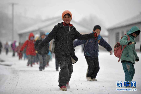 在寧夏固原市西吉縣偏城鄉,小學生在放學路后冒雪行進(12月24日攝)。自23日下午開始至24日白天,寧夏大部分地區迎來今冬首場降雪,過程降溫8攝氏度左右。據了解,此次降雪有利于降低森林火險等級和土壤保墑。王鵬攝