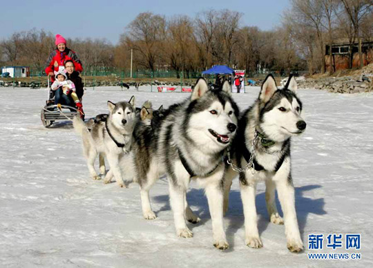 12月22日,游客在北京圓明園遺址公園乘坐狗拉雪橇。當日,圓明園皇家冰雪節開幕,期間將推出眾多雪地娛樂項目以及文化展覽活動。趙冰攝