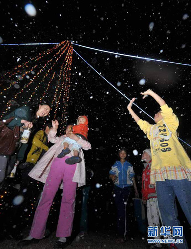 12月24日,市民和游客興奮地在“雪花”中嬉戲。當日是平安夜,海口市白沙門公園內的飄雪裝置吹起紛紛揚揚的雪花,讓市民和游客體驗到了濃濃的北國風情。郭程攝