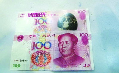 昨天上午,丹陽市民張先生忽然接到了一張小廣告,和一百元面值人民幣幾乎一模一樣,偉人頭像被一名時尚的美女模特所取代,左上角“中國人民銀行”的位置,被印成了“××發(fā)藝中心”,就連左下角該有的編號也被涂抹掉了?!叭嗣駧拧钡恼孢€印著商家的地址、電話,背面則是店面的線路圖和優(yōu)惠信息。