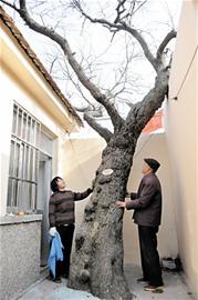 ????記者隨后趕到薛老漢家的院子里看到,他和老伴剛收拾完家當(dāng),正站在古樹旁,讓女兒給他們和古樹合影留念。這棵國槐在他家院子?xùn)|側(cè),高近十米,樹干直徑約70厘米,樹上貼著一個(gè)牌子,標(biāo)明它今年已經(jīng)309歲高齡。“早在2006年,膠南林業(yè)部門就來勘察過,把這棵樹列入青島市古樹保護(hù)范圍了。”薛老漢告訴記者。