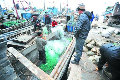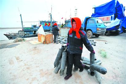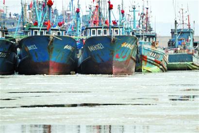 ????記者隨后驅車又趕到膠州營海碼頭,遠遠地就看到成片的漁船停靠在港灣里,大片的海面已經被薄冰覆蓋,靠近岸邊的冰層足有六七厘米厚。漁港里平日繁忙的景象不見了,零星有幾個漁民在清理船艙。由于岸邊海風太大,漁民老鄭一會用雙手捂著耳朵,一會用嘴哈氣給手取暖。他告訴記者,從四五天前港灣里就出現了薄冰,這兩天冰層開始加厚,最寬處已經延伸一公里多了。“這幾天氣溫太低,港灣里的海水比較淺,加上流動性太差,很容易就結冰了。”老鄭說,漁港里停泊著200多艘漁船,隨著氣溫逐漸降低,冰層會越來越厚,冰面也會日益增大,這些漁船會在此冰凍一個冬天。山東漁業船舶檢驗局的相關負責人告訴記者,營海碼頭等附近幾個碼頭的漁船有上千艘,從11月中旬就陸續靠岸休整,隨著冰凍期的來臨,這些漁船將在碼頭里度過一冬,“冰塊越來越多,漁船出海容易受損,人也容易出事。 ”