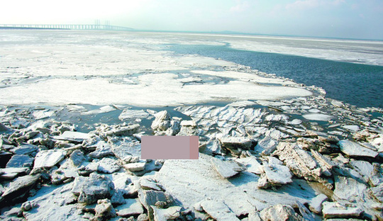 ????與環膠州灣的海域中尚能夠看到緩慢流動的海水不同,當行至女姑口附近時,大橋兩側的海水已經在海冰的“牽手下”連成了一體,特別是女姑口向北的半封閉港灣中,上千米的海面與海岸都披上了銀白色的外衣,幾乎讓人無法區分。