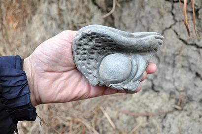 ????記者昨天看到,這個“龍眼”為陶質,掌心大小,青灰色,外側布滿了三角形的小洞。記者隨后和膠南市文物專家一起趕到現場看到,這里長滿了荒草,是一個斜坡,地勢挺高,東面和南面都曾經臨水,這里的土層明顯發黑,跟其他地方的土層有所不同,面積方圓大約近500平方米。文物專家隨后在土層表面上又發現了一些紅色或者灰色的陶片。