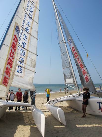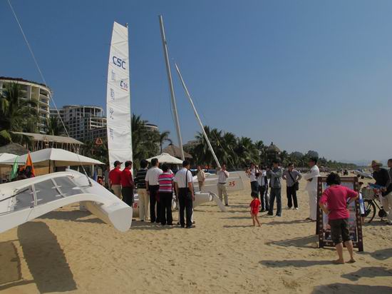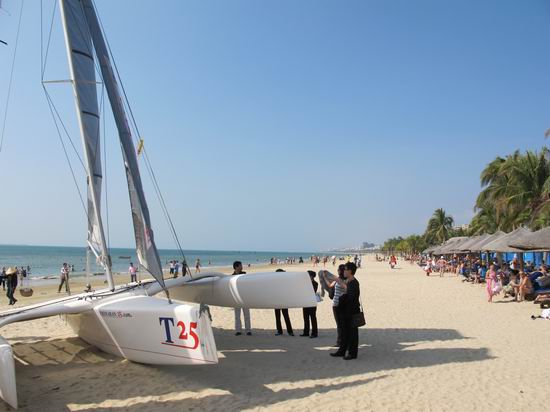 ????“帆船之都海南行”的一大亮點是使用青島自主研發(fā)、生產(chǎn)的T25三體帆船。青島加勒比海帆板帆船俱樂部為此次活動陸續(xù)提供8艘總價值達(dá)240萬元的T25三體帆船。這種由青島自主研發(fā)、自主生產(chǎn)的T25三體帆船最適合海南的沙灘,不用碼頭就可以大面積迅速開展活動;同時T25三體帆船的穩(wěn)定、安全、堅固、易駕駛的特點,最適合帆船初學(xué)者學(xué)習(xí)和帆船運動普及的一種船型。此帆船已于2010年9月列入青島市第五屆帆船公開賽的一個級別的比賽,同年10月也被韓國列入了2010年韓國木浦國際帆船賽的一個級別的比賽項目。該船的出色表現(xiàn)得到了國內(nèi)外專業(yè)人士的一致好評和肯定;