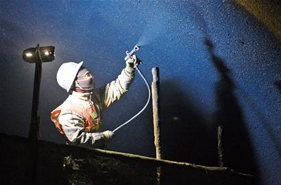 ????隨著隧道土建工程的完工,各個標段均已展開了內裝修和設備安裝。為了更好地保證全線裝修標準的一致,國信集團在全面轉入內裝修階段時,選擇在靠近薛家島端的四標段進行試驗。昨日記者來到該試驗區域看到,工人們正在隧道的內壁上噴涂最后一道防火涂料面漆,這是一種兼具防火和裝飾功能的阻燃劑,深藍色的面漆涂上后,讓整個拱壁呈現出大海的感覺。“為了充分達到防火效果,要對拱璧做三道防火涂料,首道涂料涂上后,要掛上纖維網進行保護,然后涂第二道涂料。防火涂料噴上后,通過格柵增強其整體的牢固性。最后是保護面漆,既能增強防火效果,也裝飾了整個隧道。”國信膠州灣交通公司工程技術部趙部長介紹說。