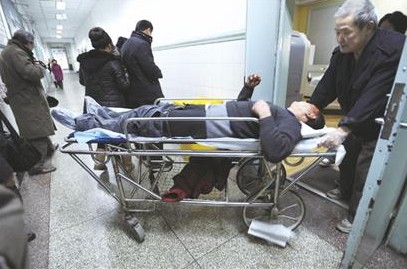 ????記者隨后趕到海慈醫(yī)院,傷者躺在CT室外的擔(dān)架車上,雙手捂住頭部,身體蜷縮,不住地呻吟。“不好,傷者出現(xiàn)抽搐癥狀了,趕緊叫醫(yī)生。”急診室的醫(yī)生趕來對其進行緊急處置。