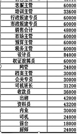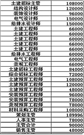 這份工資單中,年薪最高的為總經理,549996元;年薪最低的為前臺,1.8萬元。年薪在40萬以上的包括總經理、財務總監、開發副總等6人,年薪在20萬~40萬的包括成本總監、研發副總監在內的共5人,年薪在10萬~20萬的包括開發部經理、建筑設計師等20人,其余的年薪均在10萬以下,以6萬元居多。