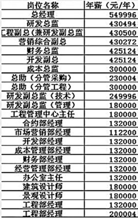 昨日,網絡上出現一則關于重慶房地產從業人員工資待遇的帖子,發帖者“好時光11”在帖中貼出了一份“重慶某開發商的詳細工資表”,當中以年薪計算,共涉及70人,從公司總經理、研發總監到前臺、廚師,每個人的年薪都一目了然,其中年薪最高的為總經理,549996元。昨日,我市某大型房地產開發商表示,這份工資表內容基本屬實,實際上,重慶部分房產商總經理年薪可達300萬。