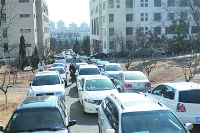 昨天下午2時,開考前,記者在海大、青大等駐青高校的校園里轉了轉,發現往日平靜的校園變得車水馬龍。在青大,鄰近考試樓的大道上,三排送考的轎車排起了上百米的長隊,加上考試樓邊上其他幾條道上的送考車,三四百輛送考車的“陣容”顯得浩浩蕩蕩,經過的學生只好小心在“車陣”中繞行。