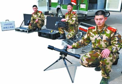 昨日,記者在現場看到,救援隊配備了多種高精裝備,包括排爆機器人、破拆機器人、高壓水槍、頻率干擾儀、有害氣體快速檢測箱等,其勢“銳不可當”。