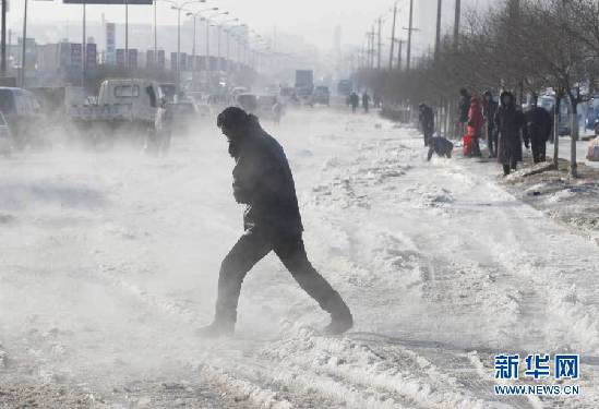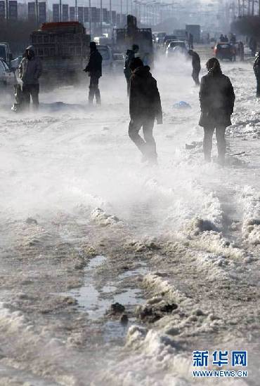 1月28日,長春市一名行人穿過發生供水管線斷裂的街道。當日,吉林省長春市青州路與西環城路交會處一供水主管線斷裂,大量自來水外溢,造成附近街道路面結冰,途經車輛嚴重受阻,給行人出行帶來不便。截至目前,當地有關部門仍對管線進行搶修。新華社發(周軍)
