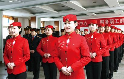 ????為了今年春運(yùn)期間乘坐動車組的旅客有個賞心悅目的乘車環(huán)境,春運(yùn)期間,濟(jì)南鐵路局青島客運(yùn)段管理的所有動車組乘務(wù)員更換新裝上車服務(wù)。新裝中西結(jié)合風(fēng)格設(shè)計,大紅色調(diào),對襟樣式,中國結(jié)盤扣,喜慶吉祥。近日,客運(yùn)段請來十一運(yùn)禮儀指導(dǎo)教師提升乘務(wù)員高端服務(wù)的能力水平,確保動車越是超員,越要保持高水平服務(wù),使得旅客在今年春運(yùn)能體會到動車上的溫馨。 (劉延青 孫義軍 攝)