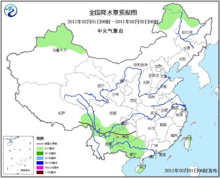 ????2月1日08時至2月2日08時,新疆北部、西藏東部、川西高原南部、內蒙古東北部、黑龍江北部、四川盆地南部、貴州中西部、云南東部和北部、華南西部等地有小到中雪(雨)或雨夾雪,其中貴州西部的局部地區有凍雨。臺灣海峽及其以南海域有6~8級、陣風9級東北風。