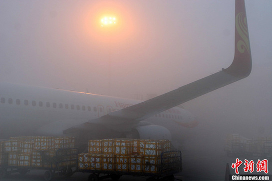 ????2月1日晨,一場大霧突襲成都平原,能見度最低時不足50米。成都雙流國際機場因大霧被迫關閉,造成大面積航班延誤或中途返航及備降其它機場,大量旅客被迫滯留機場。時值春運期間,這場大霧給雙流機場的客貨運輸帶來了極大的壓力。(中新社發 呂俊明 攝)