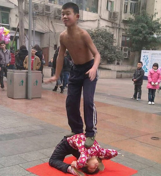 ????2011年2月8日16:00左右,拍攝地點(diǎn):重慶市九龍坡區(qū)楊家坪步行街西城天街購(gòu)物中心前 兩小孩男的十歲左右,女的六七歲吧,在街頭做雜技。資料圖