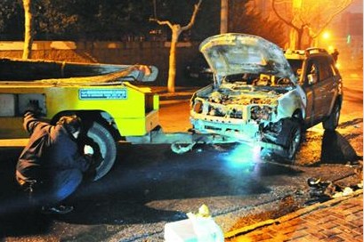 “在上清路與尖山路路口,一輛停在路邊的越野車突然起火了,火勢很大。”昨天晚上9點35分左右,市民朱先生撥打早報熱線82888000報料。記者聞訊趕到現(xiàn)場時,消防人員已經(jīng)將火撲滅,記者看到,著火的是一輛越野車,整個車身已經(jīng)被燒成了空殼,車內(nèi)一片狼藉,而停在越野車前面的一輛別克轎車,車尾被高溫烤壞,烤化了的保險杠都掉在地上。“這是我?guī)讉€月前剛買的新車,平時我開車的時候都是小心翼翼,沒想到如今成了這副模樣,叫我怎么能不心疼。”車主告訴記者,他花了30多萬買下這輛斯巴魯越野車,新車還沒開過癮就被燒成了“廢柴”,他每晚都把車停在這個地方,沒發(fā)現(xiàn)過什么問題。
