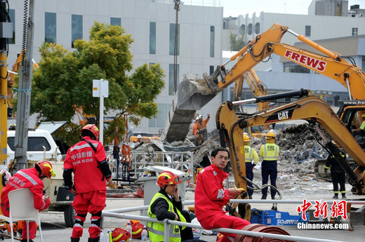 ????2011年2月26日,新西蘭克萊斯特徹奇,中國救援隊在CTV大樓展開救援工作。除廢墟清理工作外,中國救援隊還將利用生命探測設備搜尋幸存者。
