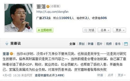 “當你40歲時,沒有4000萬身價(家)不要來見我,也別說是我學生。”4月4日,北師大教授董藩發微博稱,高學歷者的貧窮意味著恥辱和失敗。此言一出,立刻在微博上引起巨大爭議。