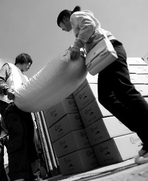 昨日下午,通州一家流浪貓狗救助站,志愿者正在搬運(yùn)狗糧。狗糧為京探網(wǎng)網(wǎng)友捐贈。本報(bào)記者 楊杰 攝