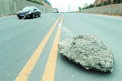 記者聞訊趕到現場,黑色本田轎車停在西向東的超車道上,轎車車頭受到撞擊變形,發動機蓋深深凹陷,擾流罩斜掛在車頭上,保險杠被刮花。車頭左前側15米處,一塊長約1米的石板橫在路中央,路面上依稀可見石板滑行留下的軌跡。“這么大塊巨石是從哪掉下來的啊?不知傷著人沒有。”一名路過市民紛紛表示驚奇,交警勘察完現場后打算把它搬到路邊,可是4個人根本沒能挪動巨石,據估計,這塊石頭至少有300斤重。