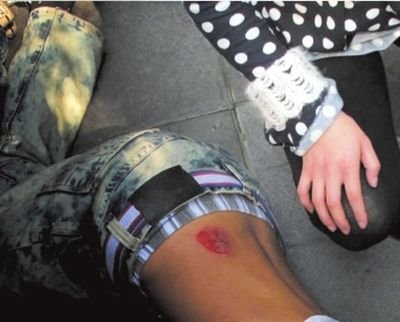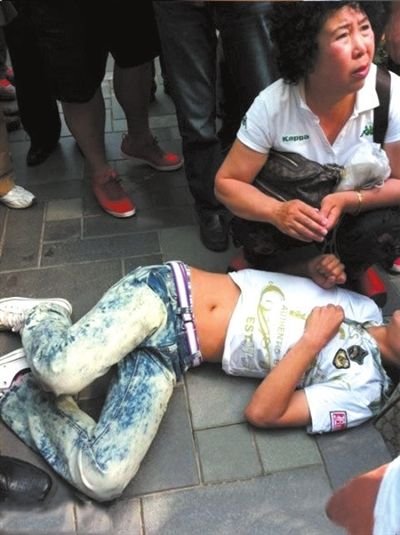 事發后,很多網友在微博上發布了關于此事的一些照片。照片顯示,在該店門口有一大堆碎玻璃。該店的工作人員不斷用水沖刷著地面。有兩名男傷者躺在地面,其中腰部有傷者,正是在朝陽醫院接受治療的丁某。