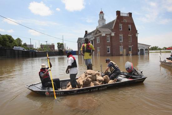 2011年5月11日,美國密西西比州維克斯堡,工人在洪水中用船只運送沙袋。密西西比河洪峰預計將直逼58.5英尺的歷史紀錄。
