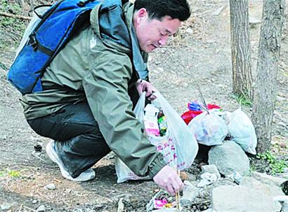 隨后,記者通過電子郵箱與kelit取得了聯系,他透露說,“環保哥”姓王,上世紀60年代生人,青島人,在一家金融單位工作,“人家是白領,撿垃圾不是為了賣錢,純粹是一種公益之心。 ”據他估算,這7年間,“環保哥”至少上山1000次,帶下山的垃圾至少有3噸,“他走的山路加起來也趕上二萬五千里長征了。撿的多是塑料袋、礦泉水瓶、玻璃瓶、方便面盒等不可降解的垃圾,堆起來的話,也得有三四座垃圾山了。 ”