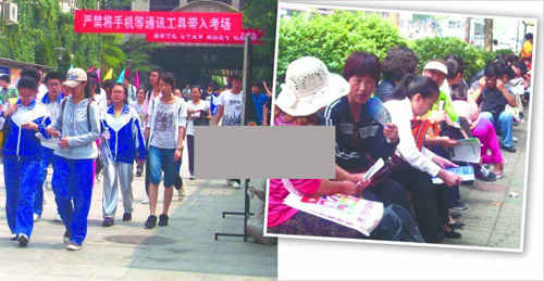 ????左圖:19中考點(diǎn),考生走出考場(chǎng)。右圖:學(xué)生在場(chǎng)內(nèi)考試,家長(zhǎng)在門外苦等。