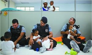 2010年9月10日,里約熱內盧,警察調解小組(UPP)的警員們訪問了“上帝之城”貧民窟新落成的一座日托中心。