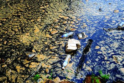 記者走到干涸的水庫底端看到,剩余的庫水呈現泥黃色,水面上還有成片的黑色漂浮物。記者靠近發現,這些漂浮物都是一些油污,中間還形成很多暗黃色泡沫狀的斑點。“那些都是些垃圾油,時間長了就像發酵了。 ”一名村民告訴記者。大量的油污積聚在岸邊,形成兩百多平方米的油污層,一些塑料瓶和塑料袋在水面漂著。記者用手蘸了蘸靠近岸邊的水,手指上立即沾上了黏糊糊的一層液體,散發著難聞的氣味。在水庫庫底裸露出來的地方,散布著大量的垃圾。