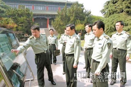 資料圖:南京軍區(qū)檔案館館長朱蒙生(左)向軍區(qū)參謀長蔡英挺(中)、軍區(qū)司令部辦公室主任方要紅(右)介紹軍區(qū)檔案館改造方案。