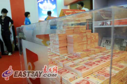 圖片說(shuō)明:某展商用透明玻璃罩蓋起一摞足有1米多高的100元大鈔,據(jù)說(shuō)總共3000萬(wàn)現(xiàn)金