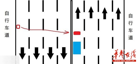 許云鶴自己繪制的模擬現場圖,藍色代表汽車位置,紅色代表王老太橫行馬路的軌跡。 許云鶴供圖