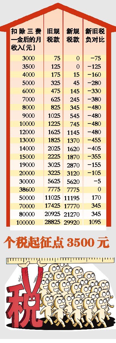 新修訂的《個(gè)人所得稅法》及其實(shí)施條例今日起正式施行。修改后的個(gè)稅法將現(xiàn)行的工資、薪金所得費(fèi)用扣除標(biāo)準(zhǔn)即坊間所稱的“起征點(diǎn)”從每月2000元提高到3500元,這意味著月工資、薪金所得在3500元以下的群體將不涉及個(gè)稅。