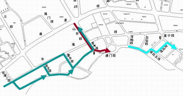 東海路山東路路口禁止自西向北的左轉原自西向北左轉的車輛經東海路—惠東路(或金平路)—澳門路—香洲路—山東路實現左轉。