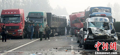 中新網淮北10月7日電 7日上午7時許,連霍高速(河南鄭州方向285公里處)發生24輛汽車連環相撞事故,截至目前事故至少造成10人死亡,多人受傷。事故造成百余車輛受阻,交通中斷達4個小時。