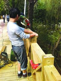 ????昨天下午,記者來到延安一路,看到從延安一路市園林局門口到動物園西門口之間的鐵欄桿已經(jīng)不見了,這里新建了別致的木棧道。 “這個木棧道真是不錯! ”市民孫廣路走在木棧道上,高興地對記者說,“走在上面,不僅可以欣賞到公園里的景色,而且還為行人提供了一處休閑的地方。 ”在現(xiàn)場,記者看到,木棧道依著公園山林的走勢曲折而建,可以容納兩三個人同時并排而行。