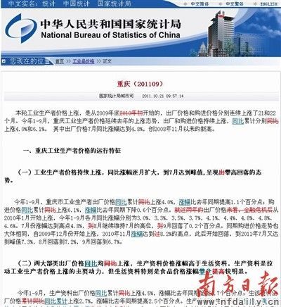 ????根據微博提供的鏈接,記者在國家統計局網站上看到了這份標題為《重慶(201109)》的工業生產者價格指數報告。該報告是對重慶市今年9月份“工業生產者價格上漲”的分析,其中有對“重慶工業生產者價格的運行特征”的分析,還有“影響重慶工業生產者價格因素分析及全年預測”。其結論是:“全年重慶市工業生產者價格仍將保持平穩運行態勢”。