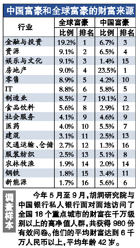 胡潤(rùn)認(rèn)為,對(duì)比今年“胡潤(rùn)百富榜”1000名上榜富豪和全球前1000名的富豪可以發(fā)現(xiàn),中國(guó)富豪在財(cái)富來源上與全球富豪有明顯的區(qū)別,中國(guó)有四分之一的富豪的財(cái)富來源于地產(chǎn),而全球富豪從事地產(chǎn)行業(yè)的占比還不到十分之一。在制造業(yè)的比例上,中國(guó)也明顯高于全球。