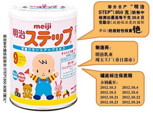 ????明治稱,檢測出銫的是保質期為2012年10月3日、4日、5日、6日、21日、22日、23日、24日的奶粉。保質期顯示在奶粉罐底部。這些奶粉均為埼玉縣春日部市的明治工廠生產。公司稱,可能是在對原料進行干燥處理時混入了大氣中的銫。據悉,用于制成原料奶粉的牛奶是在福島核電站事故發生前生產的。