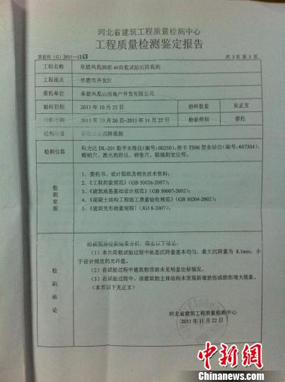 鳳凰御都小區張帆攝 河北省建筑工程質量檢測中心出具的工程質量檢測報告張帆攝 中新網承德12月31日電 (張帆) 近日《河北承德數百名干警團購住房遭遇“樓歪歪”》一文經中新網發出后,引發廣泛社會關注。2011年12月31日,河北承德鳳凰山房地產開發有限公司承諾,業主可在同等面積基礎上調換新房。 據悉,鳳凰御都、鳳凰御苑小區的各方責任主體已成立調查小組,對小區內每家每戶做拉網式排查,對小區內業主發現及提出的問題積極解決,對設計有缺陷的地方及時處理,直到滿足和達到其正常使用功能。 關于鳳凰御都4#樓體出現不均勻沉降、傾斜問題,承德鳳凰山房地產開發有限公司總經理張智興30日對中新網記者說,2011年5月4日,鳳凰御都4#樓主體建設過程中監測發現樓基確實出現了沉降不均勻現象,沉降差約為4cm。 張智興說,樓體出現不均勻沉降、傾斜后,設計單位現場勘查其主要原因是鳳凰御都4#樓原是該地塊最低點,無排水設施,長期積水后造成的。 據介紹,2011年8月20日至9月22日,鳳凰山房地產開發有限公司委托“中鐵西北科學研究院”采取鉆孔、混泥土注漿方式對鳳凰御都4#樓進行了糾偏處理及地基加固。為保證其使用安全,2011年10月26日至11月22日,又請“河北省建筑工程質量檢測中心”采用現場多個房間同時堆積沙包的方法對該樓進行了荷載試驗,經檢測,沉降不均勻問題已得到徹底解決。 張智興表示,如果鳳凰御都4#樓的業主們對其樓體的安全仍然存在擔憂,該公司承諾在鳳凰御都、鳳凰御苑小區剛剛封頂的高層內可調換同等面積的住房,樓層任選,多出的面積依舊按其當初的團購價折算(單價無差價)。 31日,承德市工程質量監督站站長王廣珍在接受記者采訪時表示,該站認為鳳凰山房地產開發有限公司對鳳凰御都4#樓采取的加固方法是正確的,并已通過了質監部門的驗收。王廣珍說,“如果當初加固不安全肯定會責成其推倒重建的。” 當記者問及小區內其他樓房是否也存在沉降問題。王廣珍稱,沉降肯定是存在的,根據地質情況,如果沉降在允許范圍內,只要不是速度太快,而是“均勻”沉降,就不會對建筑物產生危害。 對于小區內衛生間未安裝取暖設施、部分塑鋼窗框變形及不能使用等一些質量問題。王廣珍說,承德市住房和城鄉建設局31日已要求小區各方責任主體成立調查小組,對鳳凰御都、鳳凰御苑小區的608戶住房進行全方位逐項排查,對不符合設計要求和規范及影響使用功能的,由施工單位提出處理意見,報監理和建設單位同意后,按照技術方案認真處理,免費重新安裝、更換,直到達到規范要求和使用功能。 據了解,根據承德市政府2010年37號文件規定,樓房應由城市管理局、規劃局、住房和城鄉建設局、園林局、市紀委、市法制辦公室、消防支隊等相關部門共同組成聯合調查小組,由調查小組出具聯合驗收報告后才能交付使用。目前,承德鳳凰山房地產開發有限公司未辦理相關驗收手續。 |